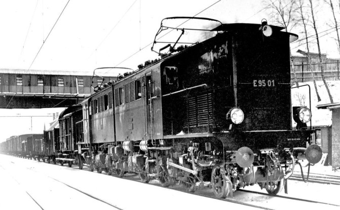 Die E 95 01 im Winter 1928 in Rothenburg. Copyright: Werkfoto AEG/Slg. H. Linke/Slg. Eisenbahnstiftung.